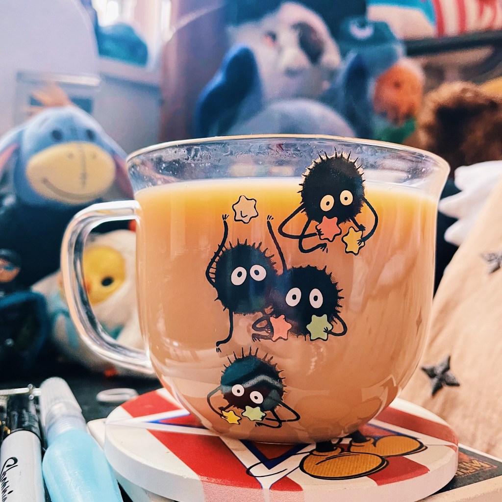 This week’s photo is a cup of afternoon tea, served in an adorable glass teacup that features cute little soot sprites from Spirited Away.