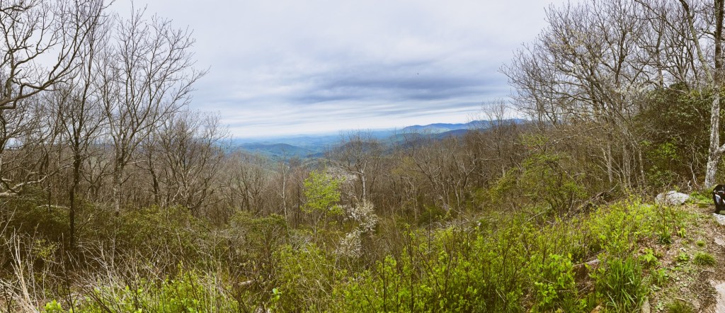 This is a panoramic shot of the view from the top of Springer Mountain, the first White Blaze on the Appalachian Trail. The trees here are still asleep, but it is still a stunning view of the mountains.