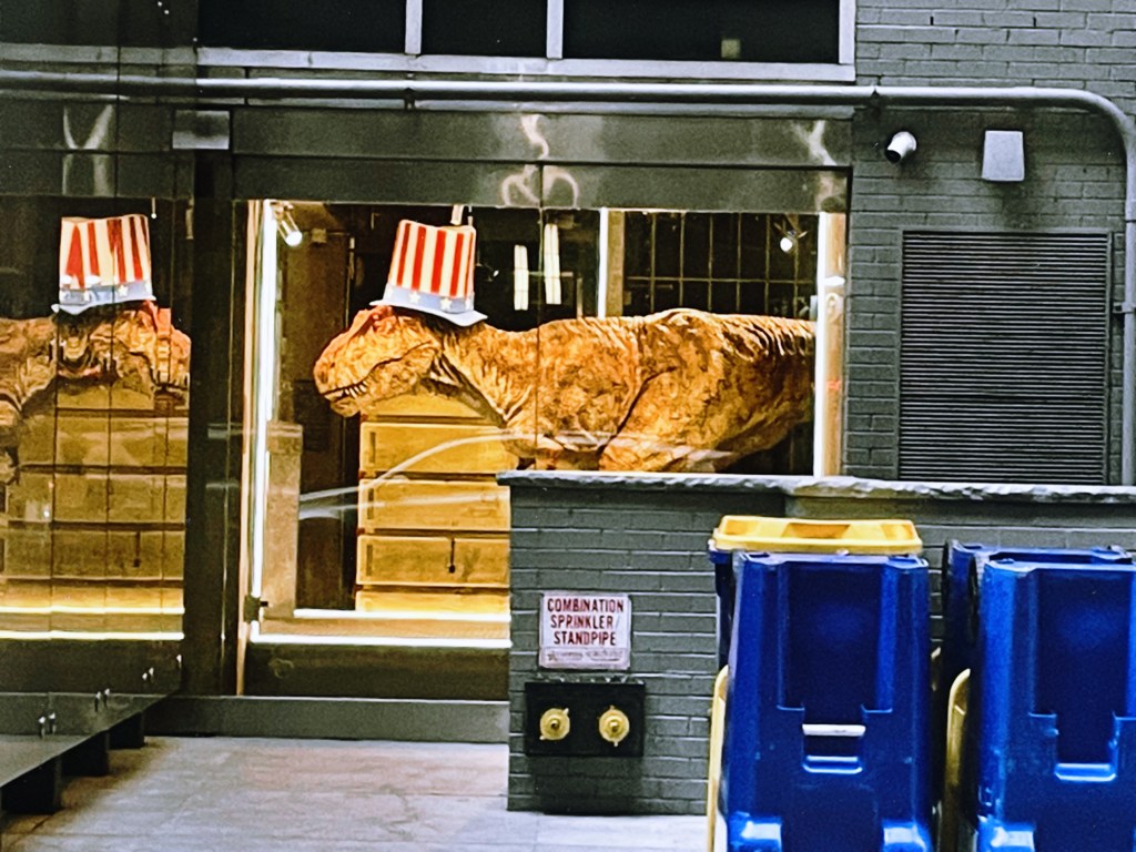 I saw this dinosaur in a hotel lobby window as we drove down the streets of New York.