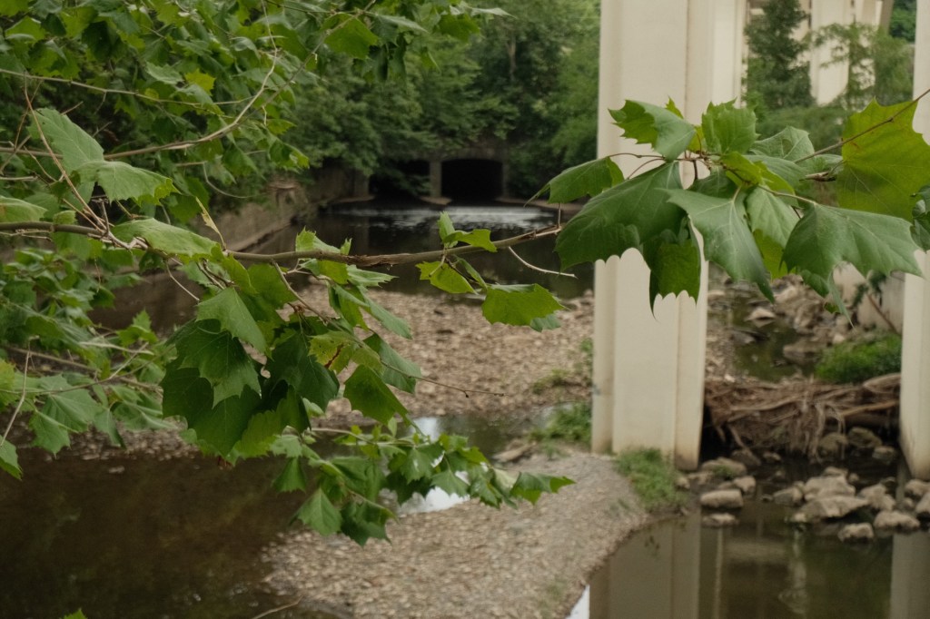 There is a large bridge that passes over part of the Zoo, this is one of the undersides. There is a little river/stream that runs through there, and there is a lot of greenery.