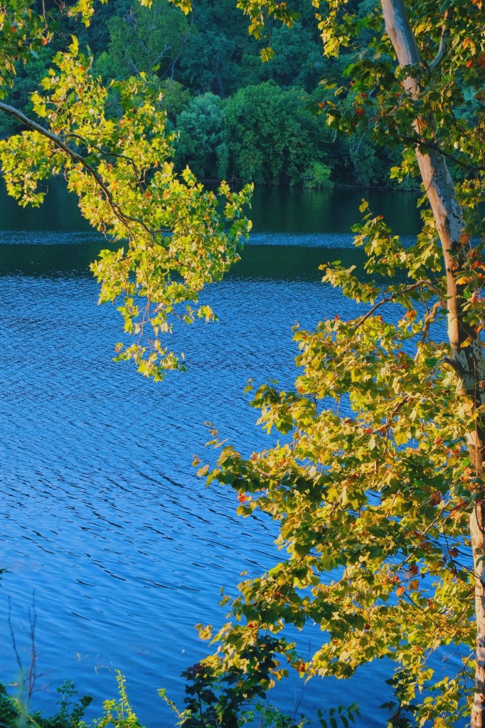 A view of the river through the trees. The evening light made the leaves look so pretty.